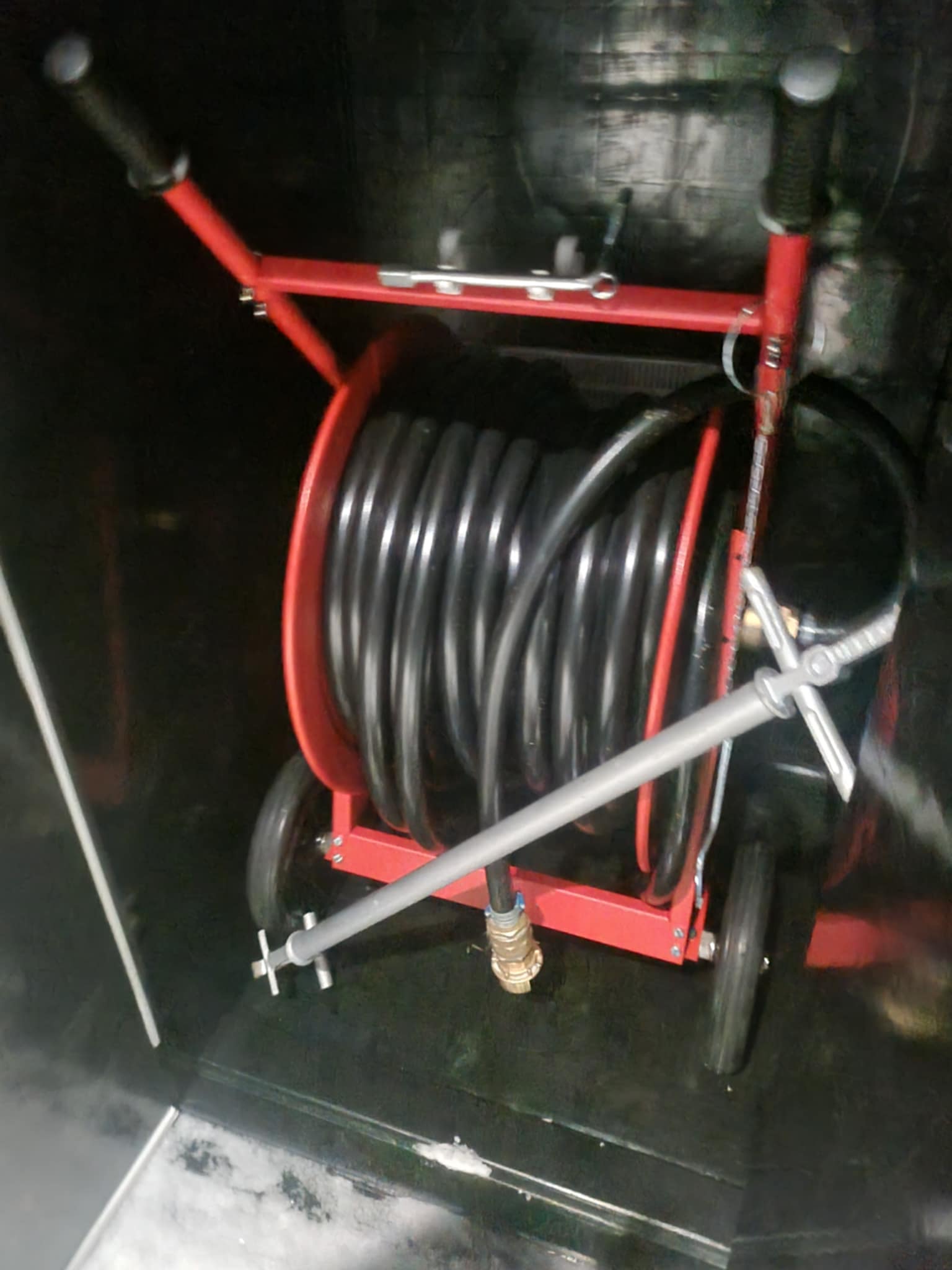 - Lås opp skap, her finner du slangevogn med sveiv, krannøkkel og kumlokkåpner.