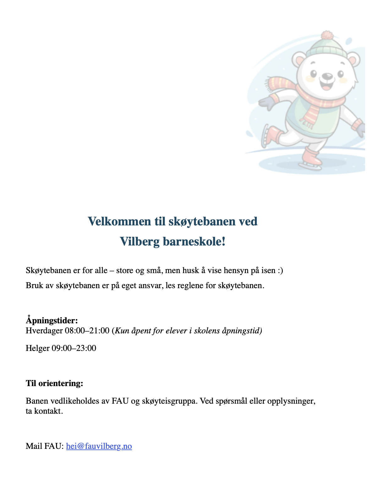 Vil du bidra? For å få dette til trenger vi engasjerte foreldre/foresatte. Dersom du vil være med i skøyteisgruppen for ditt trinn, ta kontakt med klassekontakten din. Vi gleder oss til å skape et hyggelig og aktivt vintertilbud resten av vintere for barna – sammen